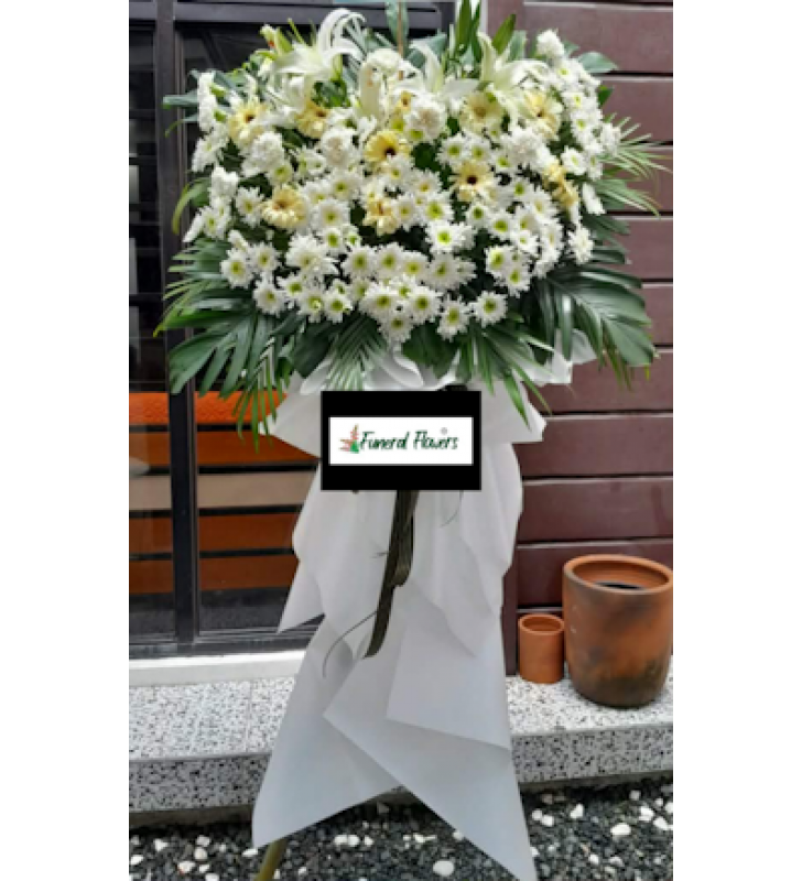One layer standing arrangement. All white lilies,gerberas and malaysian mums.