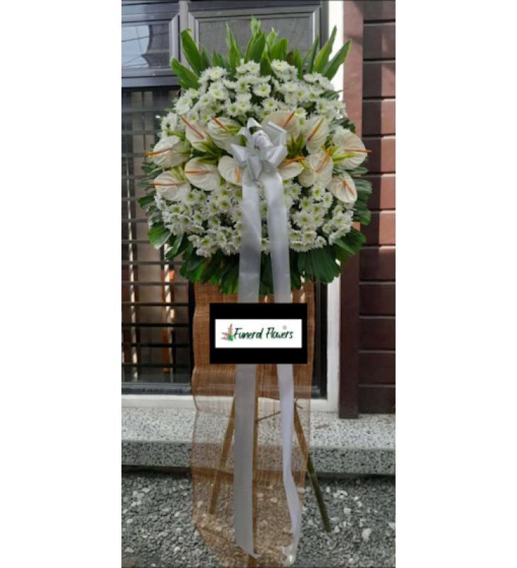 One layer standing arrangement. All white anthurium and malaysian mums