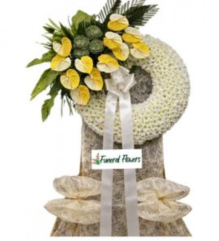 Funeral wreath standing arrangement. Mixed flowers anthurium, malayian mums and tropical flowers
